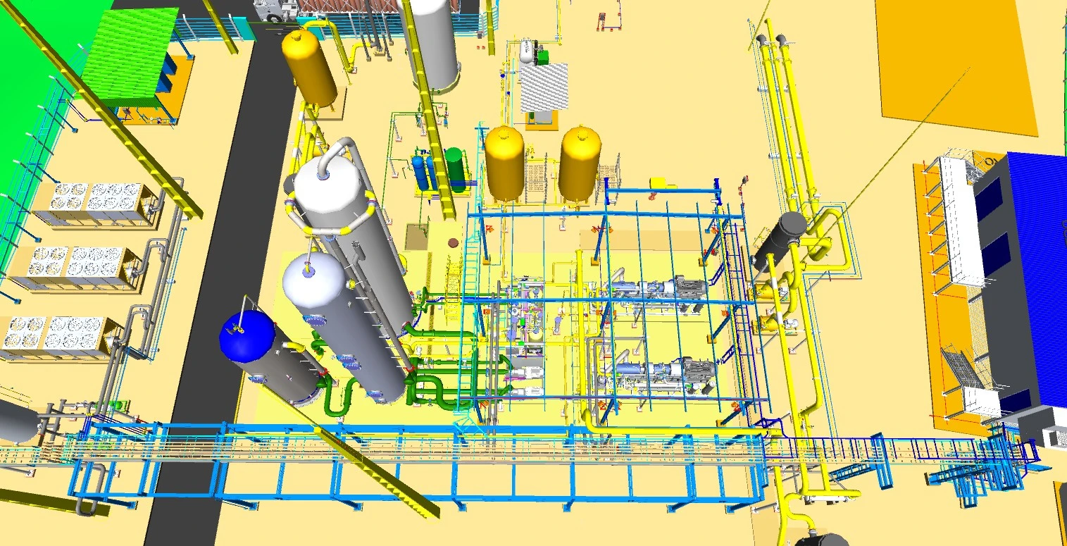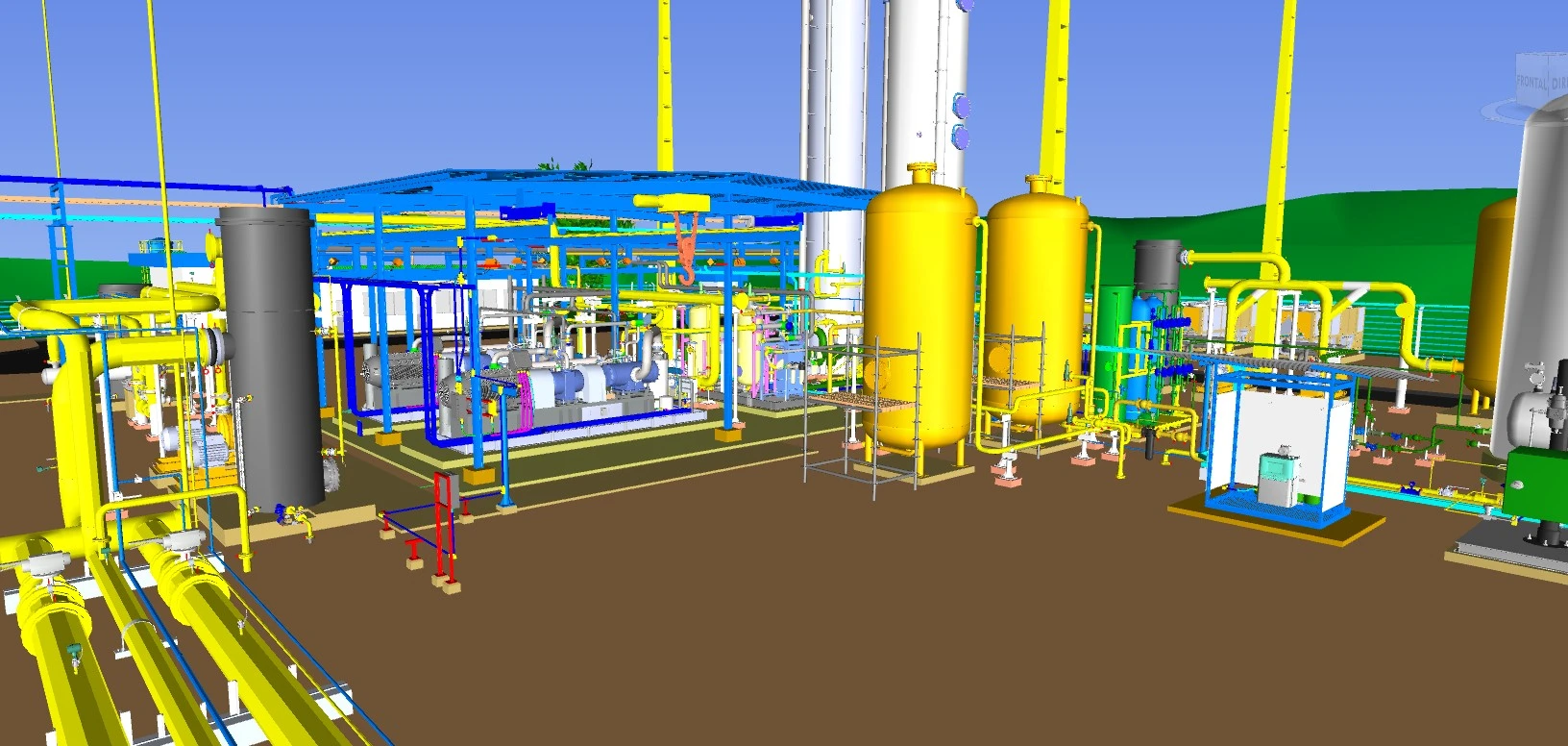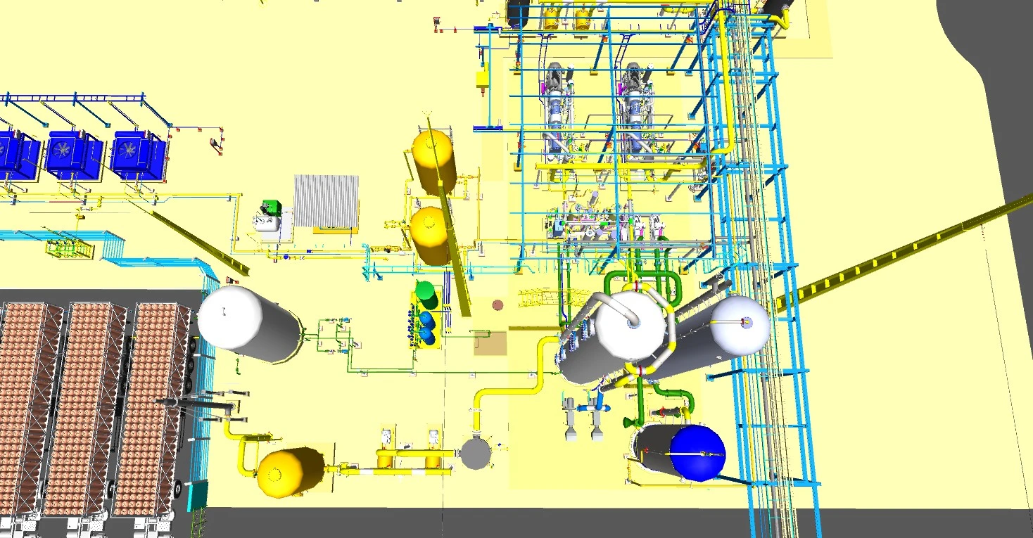 Fomos responsáveis por desenvolver toda a solução de engenharia relacionada à implantação da planta de purificação, incluindo o sistema de utilidades, a estação de enchimento de carretas-feixe com gás a 250 barg, a instalação de eletrocentros e subestação, além de toda a área administrativa e de apoio.